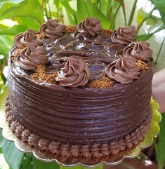 La oscuridad de la luna invisible recreada de manera deliciosa. Disco de pastel de chocolate relleno y cubierto con el fudge Tarisznyás de chocolate. Una luna nueva de desmesura, como corresponde a la pasión por el chocolate.